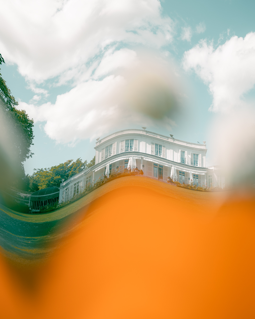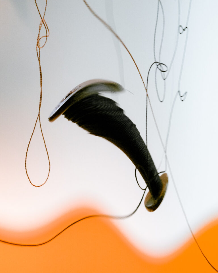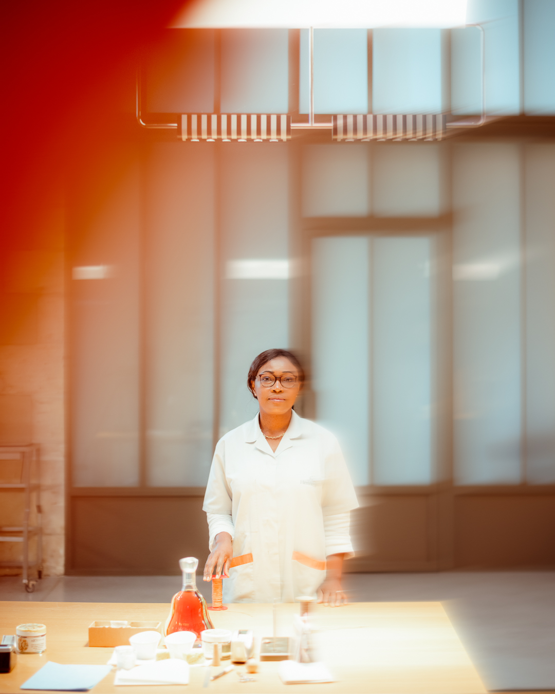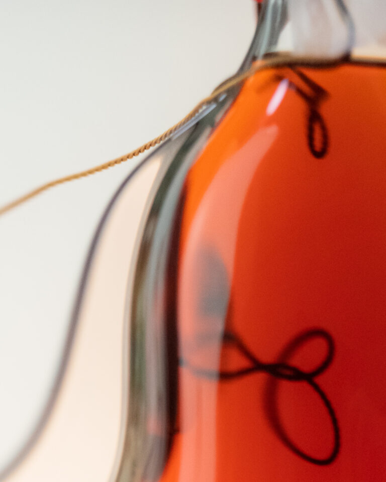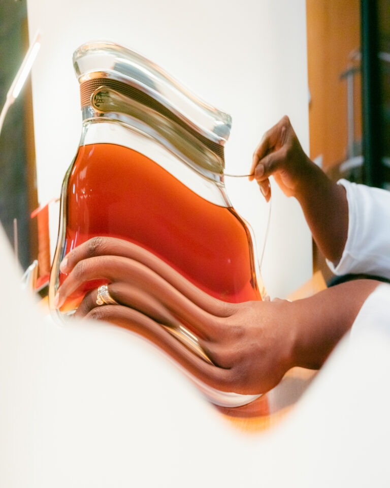 “Ce sens de la transformation s’est traduit par l’utilisation de la couleur orange pour évoquer Hennessy et faire un pas vers le rêve incarné par la Maison : une teinte qui évoque la couleur du cognac, mais aussi le feu – élément essentiel pour la fabrication des tonneaux contenant le précieux liquide. L’artiste a été captivé par les multiples métiers représentés au sein de l’Atelier des Éditions Rares: la calligraphie, le travail du cuir, et tous les moindres détails encore entièrement réalisés à la main. Etienne Francey a en particulier arrêté son objectif sur la pose des fils de soie – un geste d’une extrême élégance. Il a imaginé une photo mettant en valeur le contraste entre une bouteille ample et lourde et la légèreté du fil qui s’enroule délicatement autour du verre.” – LVMH
